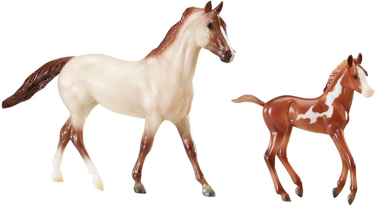 Mustangs are feral horses that are found in the American west. They descended from horses brought to the Americas in the 16th century by Spanish explorers. Today they’re protected by the Wild Free-Roaming Horses and Burro Act, which calls mustangs “living symbols of the historic and pioneer spirit of the West.” This set includes a red roan stallion and his chestnut pinto foal.