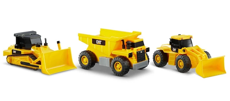 The Cat Power Mini Crew is ready to work! These push-powered vehicles come equipped with realistic lights and sounds and articulated buckets and booms just like the real machines. Push the button to bring the action to life! 2 AAA batteries included. Features Dump Truck, Front Loader, and Bulldozer vehicles.
