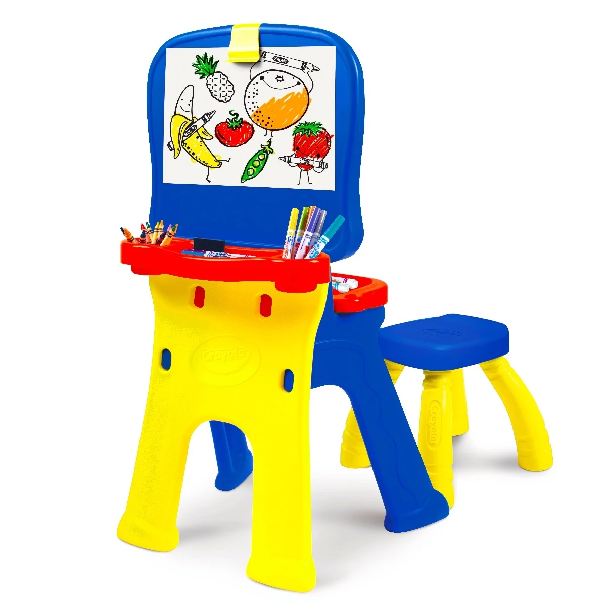 The Crayola Triple-the-Fun Art Studio is a great art studio and easel that allows for two users as once. One side provides an area to sit and draw on, while the other allows a second child to enjoy creating original artwork. The board conveniently flips down for one child, turning it into a desk in just a matter of moments. The boards are easy to clean and contain two storage trays, a paper cup, eraser, stool, and 77 magnetic letters and numbers.