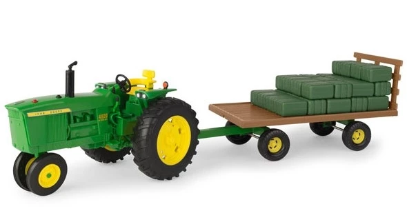 Set includes 4020 Narrow Front Tractor, hay wagon, and 36 bales to provide classic farm play! The 4020 features lights and sounds and easily attaches to the hay wagon. Compatible with other 1/16 Big Farm tractors and implements. 3-AAA batteries included.