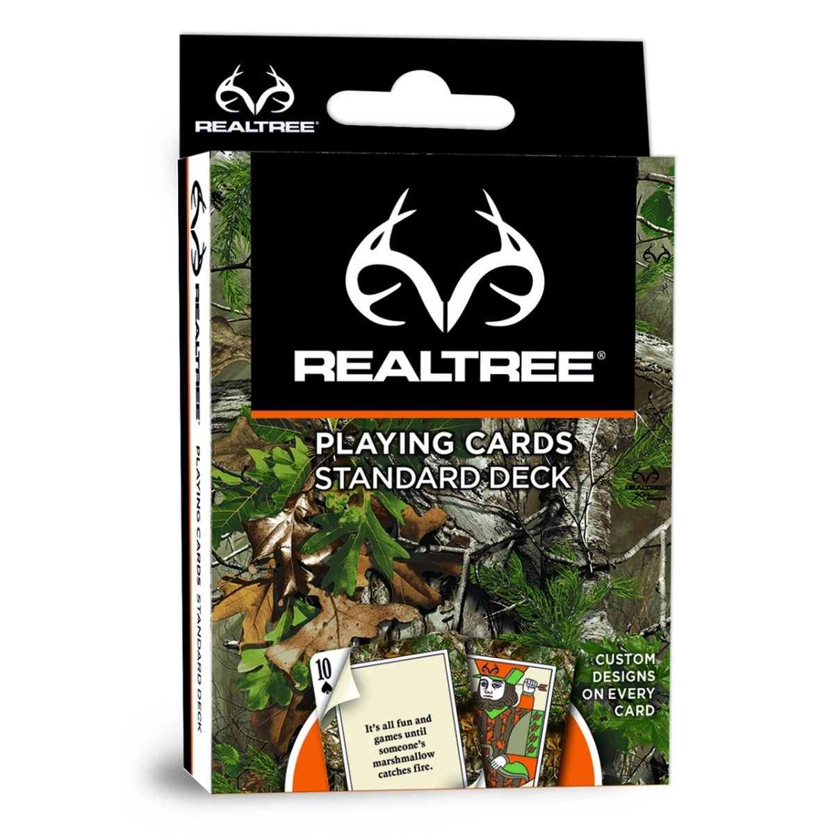 These Realtree playing cards are the perfect deck for any camo fan! Each standard deck contains 52 cards and 2 jokers. Card-back designs feature the Realtree logo. All face cards and jokers have detailed, custom hunter and fisherman designs. Officially licensed and approved Realtree playing cards.
