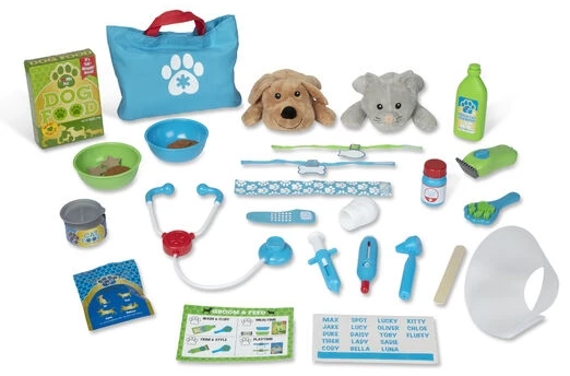 Give young animal lovers everything they need to examine, treat, feed, and pamper pretend plush pets! The 32-piece collection for aspiring veterinarians and groomers three and older comes with two adorable plush pets (a dog and a cat), and accessories galore, including vet supplies like a stethoscope, thermometer, syringe, bandages, a cast for boo-boos, and even a neck cone! Grooming supplies include vibrating trimming shears, pretend shampoo, and brush. Reward plush pets with treats, play food, and more. Keep track of appointments on the reusable activity card and personalize collars and tags with stickers. All the supplies store in a handy tote bag for speedy cleanup and to take fun on the go!