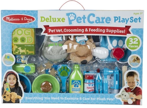 32-piece pet vet, grooming, and feeding play set with plush dog and cat and realistic supplies and accessories