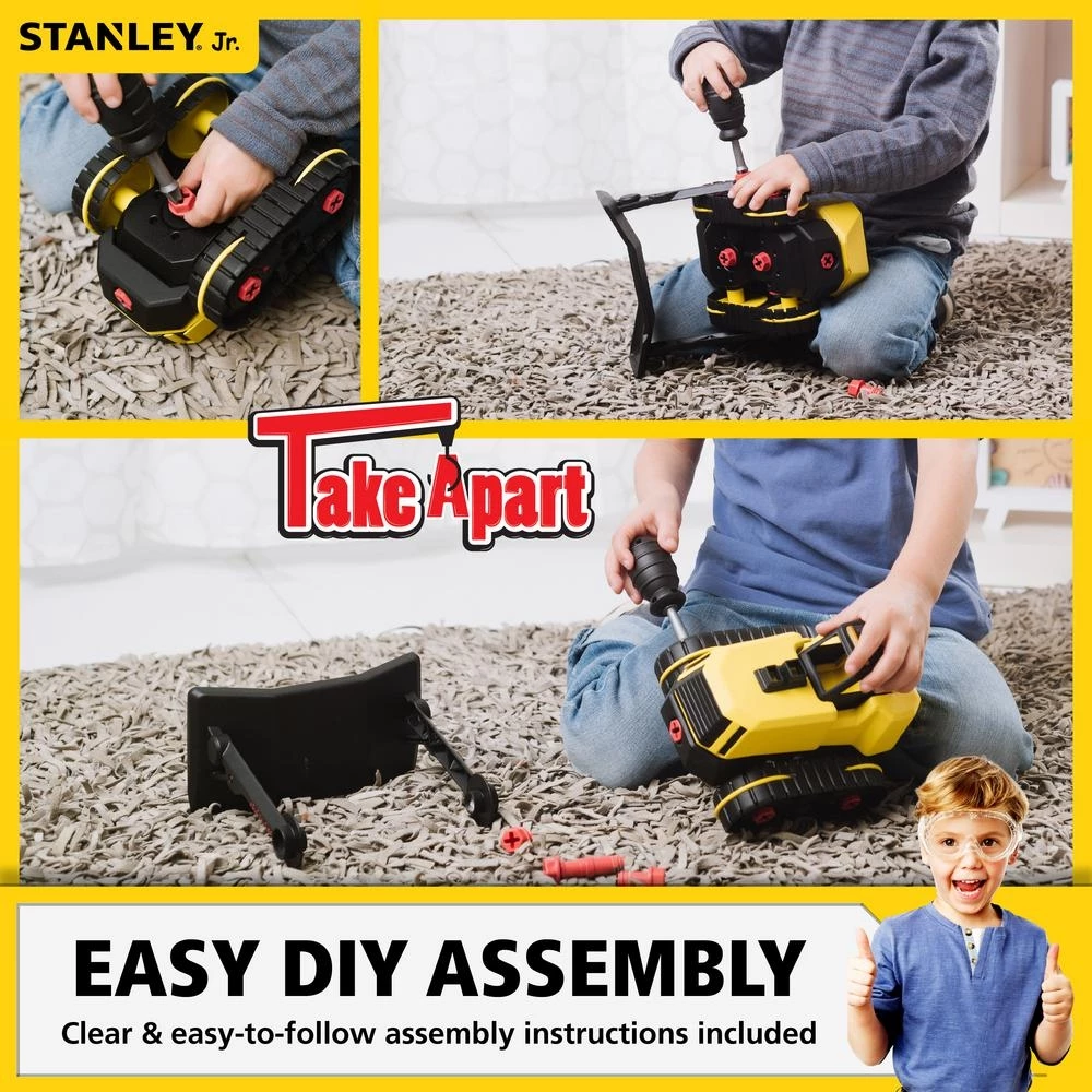 - Complete take apart toy kit: the Stanley Jr stem bulldozer kit model TT005SY is perfect for children who like to take apart and put back together toy construction vehicles, this 24-piece set comes with all parts necessary to build a construction bulldozer truck that measures 10 in. x 7.3 in. x 6 in., with a plastic screwdriver, bolts and figure added, it arrives in a gift box with instructions, ready for that young want-to-be construction worker in your life