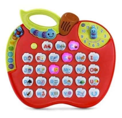 Pick up the ABC Learning Appleâ„¢ for an apple a day of learning and play! Twenty-six easy-to-press letter buttons on this interactive learning toy teach the alphabet sequence, phonics sounds, letter names and spelling, and play melodies and sound effects. Keep children interested and challenged with progressive learning levels. Start in Phonics World to hear letter sounds, then switch to Discovery Time to learn about words and letter order. Follow the light-up buttons to practice spelling with the Spelling Game. Move the worm clock hand around the play clock to explore time concepts, then switch to Feed the Hungry Worm to practice counting. Ready to practice memory skills? Turn on the Dancing Lights game and try to repeat the light-up patterns on the apple. Go to Music Festival when you’re ready to get up and dance! Find out what you’ve learned by quizzing yourself in Eye Spy. This educational apple helps preschoolers get ready for school. Bring this portable toy anywhere for bushels of fun and learning on the go!Â