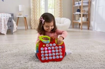 Pick up the ABC Learning Appleâ„¢ for an apple a day of learning and play! Twenty-six easy-to-press letter buttons on this interactive learning toy teach the alphabet sequence, phonics sounds, letter names and spelling, and play melodies and sound effects. Keep children interested and challenged with progressive learning levels. Start in Phonics World to hear letter sounds, then switch to Discovery Time to learn about words and letter order. Follow the light-up buttons to practice spelling with the Spelling Game. Move the worm clock hand around the play clock to explore time concepts, then switch to Feed the Hungry Worm to practice counting. Ready to practice memory skills? Turn on the Dancing Lights game and try to repeat the light-up patterns on the apple. Go to Music Festival when you’re ready to get up and dance! Find out what you’ve learned by quizzing yourself in Eye Spy. This educational apple helps preschoolers get ready for school. Bring this portable toy anywhere for bushels of fun and learning on the go!Â