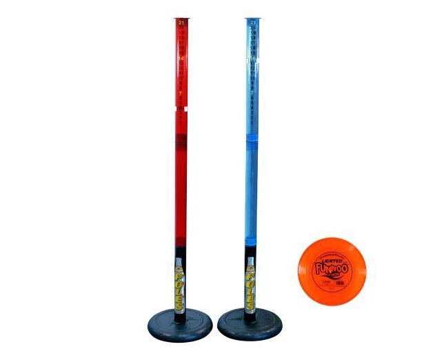 The Deluxe Lighted Pole Game includes lighted poles, flat bases, yard/beach spikes, a lighted flying Frisbee disc, and scorekeepers. With this kit, 2 teams (up to 2 players each), try to knock an object off the opposing team’s pole using a flying disc. Each team requires one pole and one object. The poles should be stationed approximately 27 feet apart, and teams take turns throwing discs in hopes of knocking the object to the ground. When the sun goes down, the poles and discs light up the sky with a luminescent glow. Colors and packaging may vary.